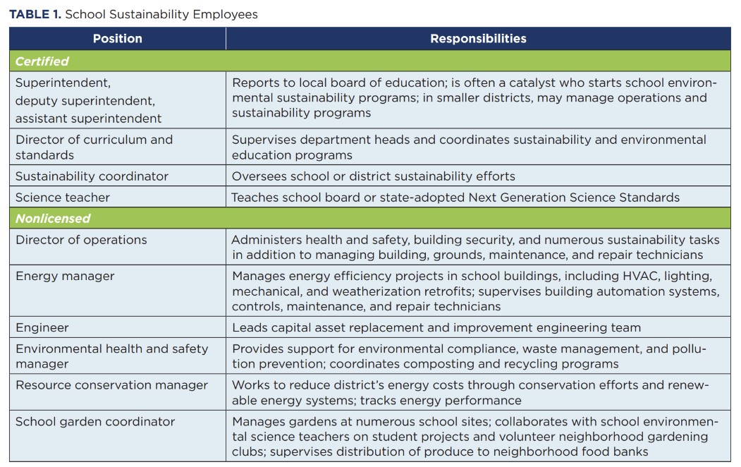 Table 1 identifies some of the sustainability employees in today’s schools. The list includes long-standing certified and nonlicensed staff positions that have been tasked with additional responsibilities related to sustainability. Successful school environmental sustainability programs depend on two additional classes of individuals: contract workers and parent volunteers.