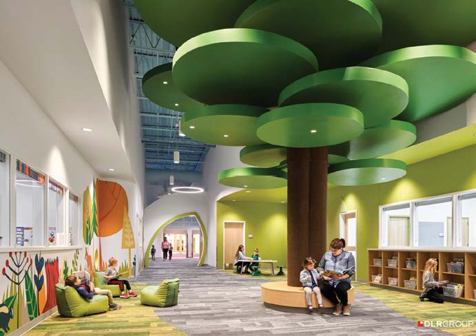 The large space might sound overwhelming until one has the opportunity to walk through its halls. The design firm and design team broke the vast expanse into seven welcoming “neighborhoods.” Each neighborhood is identified by a color and biophilic theme that represents early childhood. For example, the blue neighborhood is represented by water for absorbing, and the red neighborhood is represented by birds for soaring. The award-winning murals bring the themes to life.