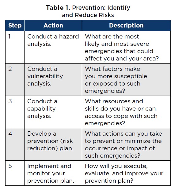 To get you started, I have created four tables that can guide your emergency preparedness strategy. They are based on PromotePrevent.org’s four phases of emergency management: prevention, preparedness, response, and recovery. The strategies also follow the principles of the SMART framework: Specific, Measurable, Achievable, Relevant, and Time-bound.